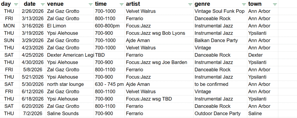 Ferrario plays classic rock for high energy dancing and fun. Velvet Walrus is gaining traction with a vintage funky smooth sound for dancing or just relaxing. Focus:Jazz plays classic instrumental Jazz with spontaneity and joy. Social District is a hip jazz outfit with vocals that started as a trio, but recently added a smooth sax to round out as a quartet. And Ajde Aman is a Pan-Balkan influneced world music ensemble that plays in odd meters for dancing and chill vibes.